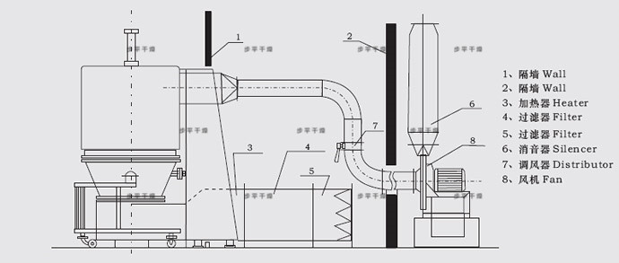 空气经加热净化后,由引风机从下部导入,穿过料斗的孔网板。在工作室内,经搅拌和负压作用形成流态化,水份快速蒸发后随着排气带走,物料快速干燥。